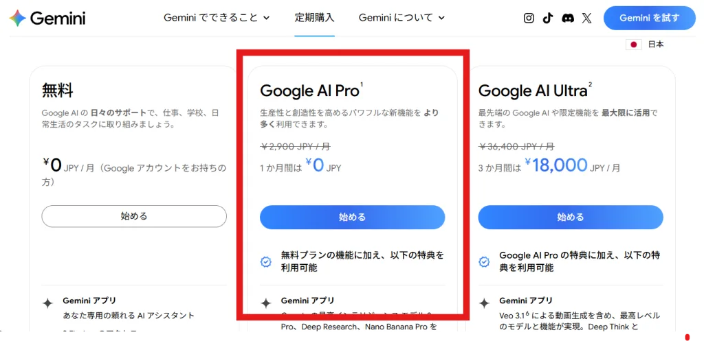 お次はGoogleが提供するGemini。こちらも一般的な有料プランのAI Pro(月額2,900円)です。